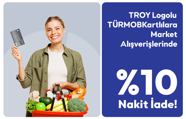 Troy Logolu TÜRMOBKart’la Yapacağınız Market Harcamalarında %10 Nakit İade Fırsatı Sizi Bekliyor.