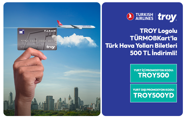 TROY Logolu TÜRMOBKart’la Türk Hava Yolları’ndan alacağınız yurt içi ve yurt dışı biletlerinde 500 TL indirim fırsatı sizi bekliyor.